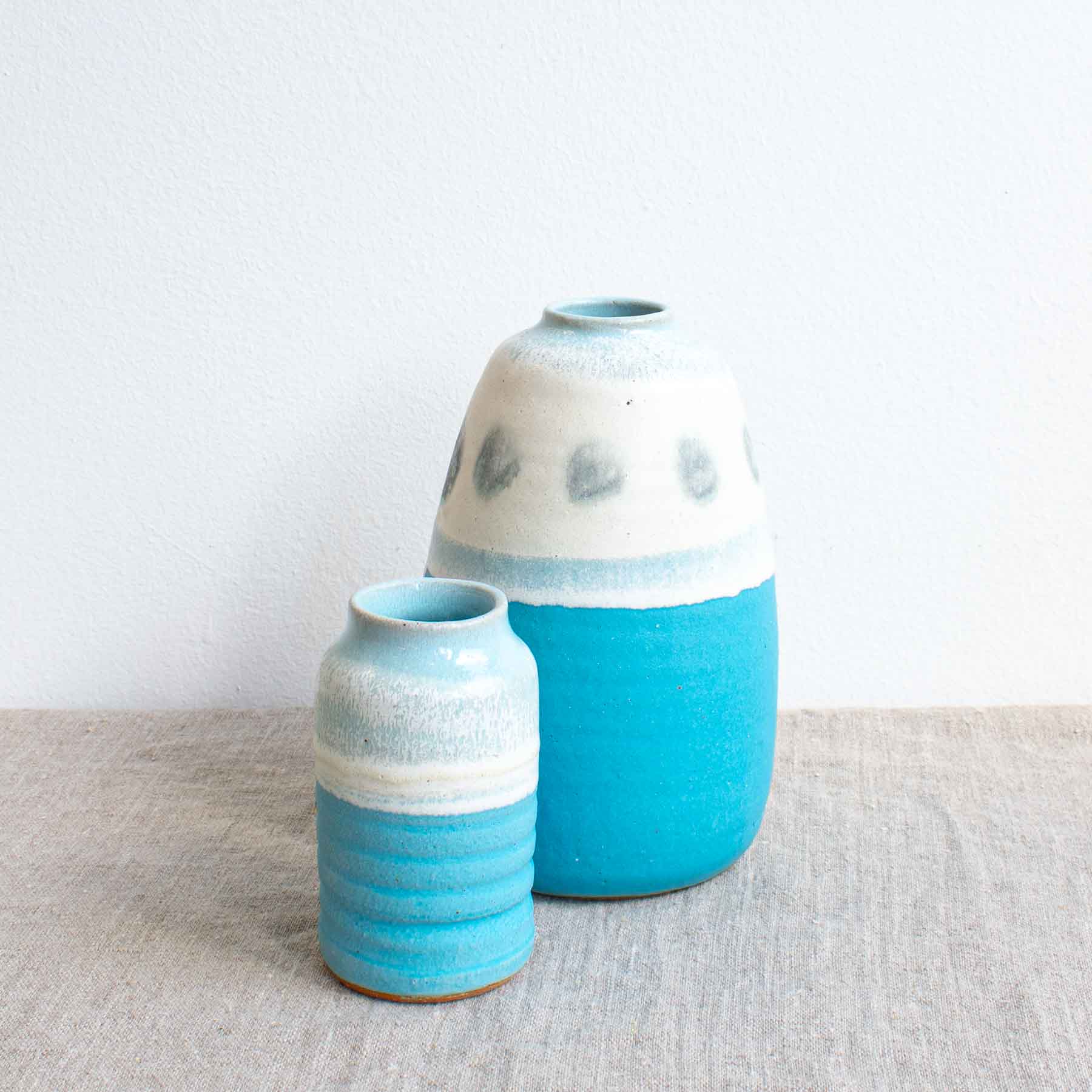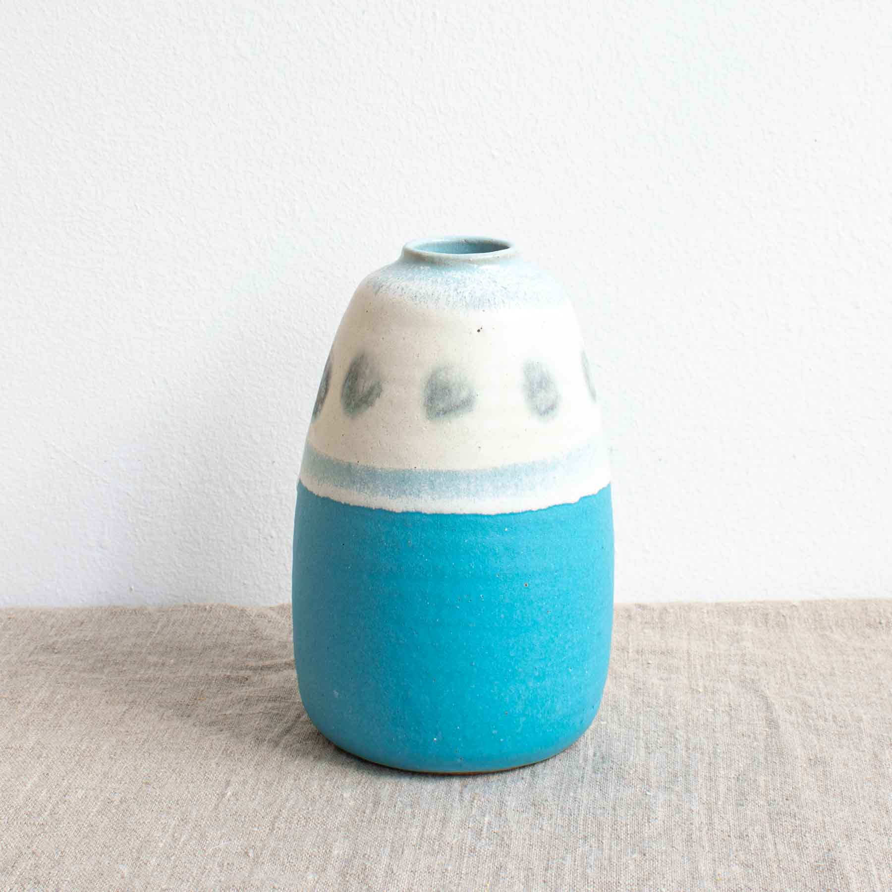 Wheel-thrown, Cornish stoneware tall vase decorated with turquoise blue and white glazes, and a subtle dot design.