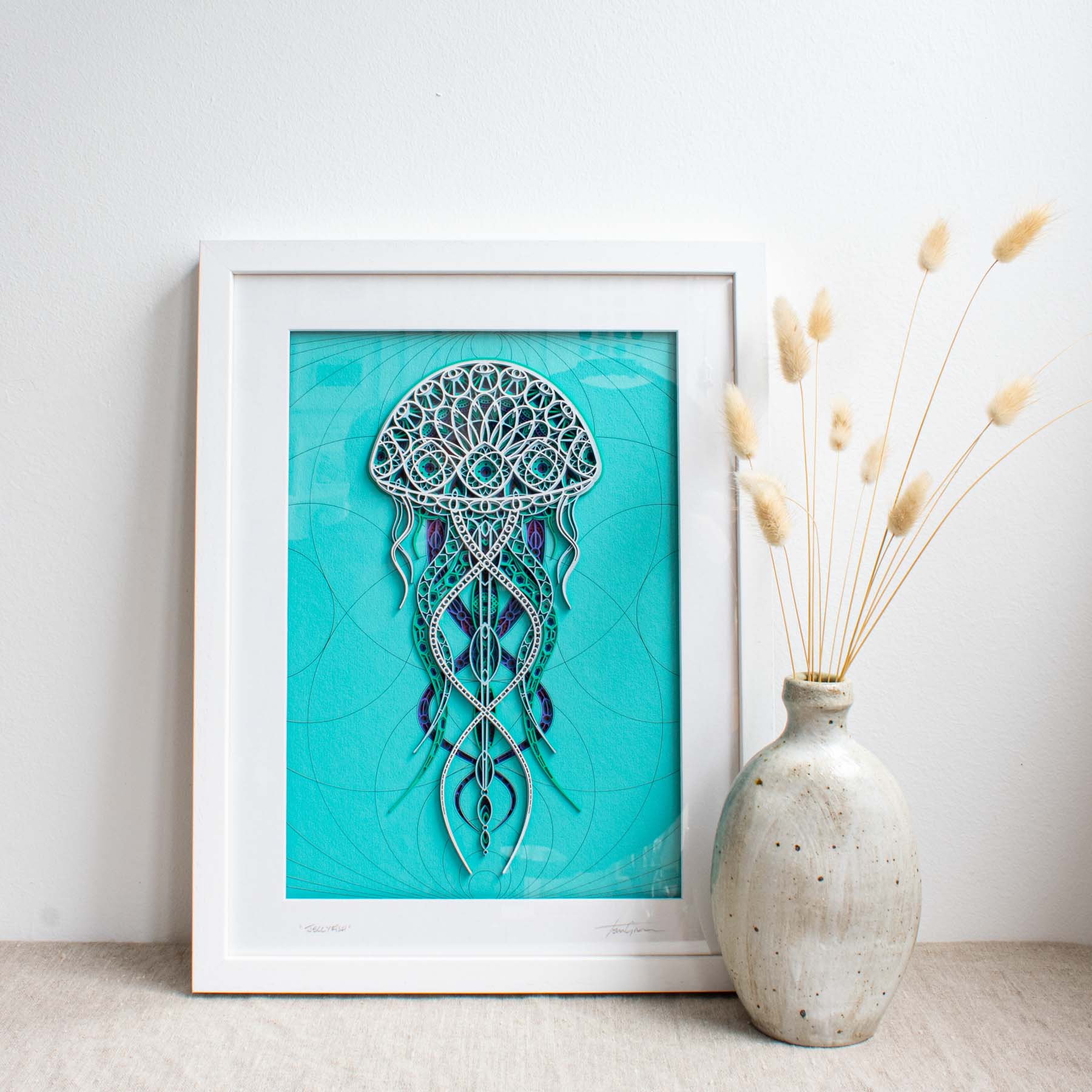 Multi layered jellyfish artwork constructed from eight layers of laser cut card, hand coloured and framed to create a 3D image with amazing detail.