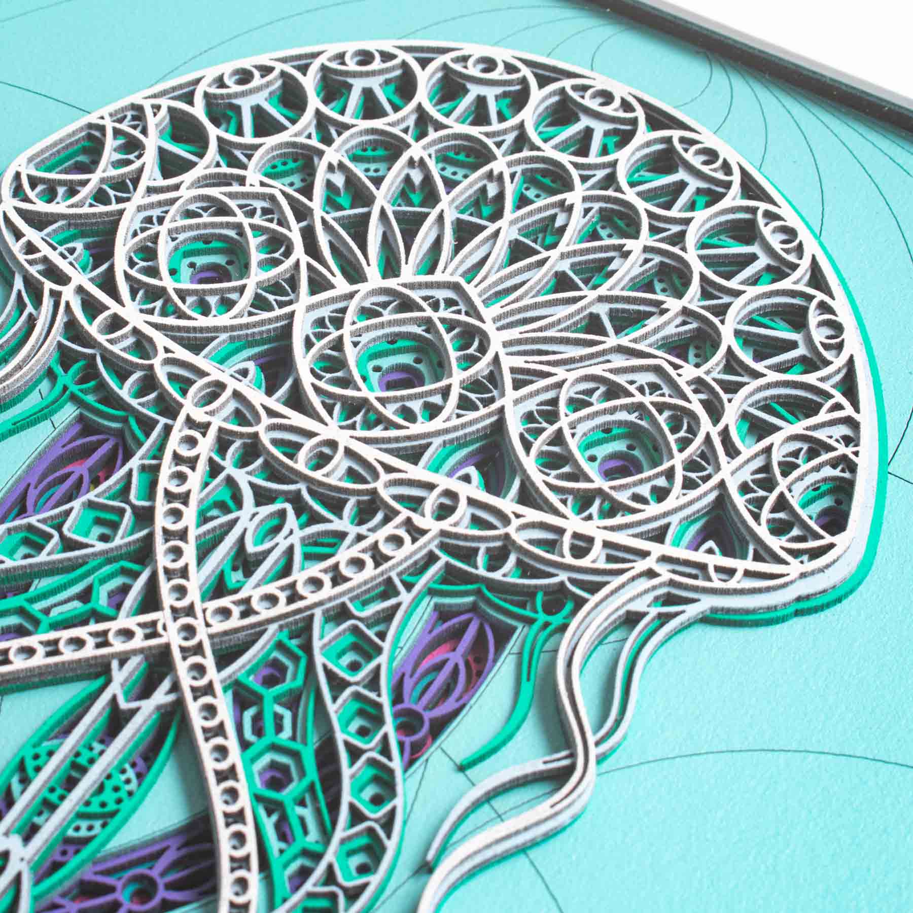 Multi layered jellyfish artwork constructed from eight layers of laser cut card, hand coloured and framed to create a 3D image with amazing detail.