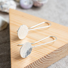Handcrafted sterling silver drop earrings open “pebbles” on silver earwires.