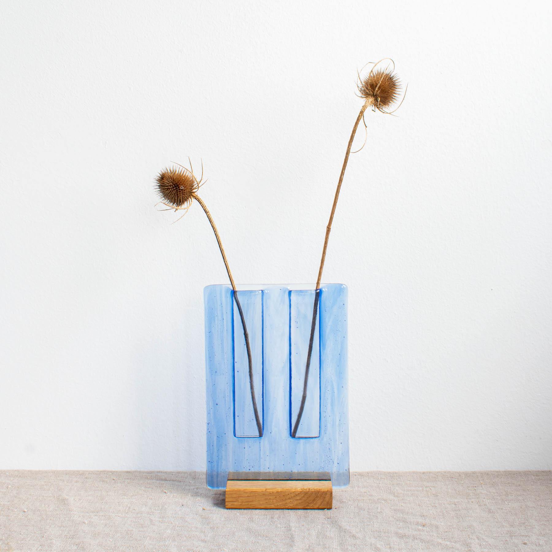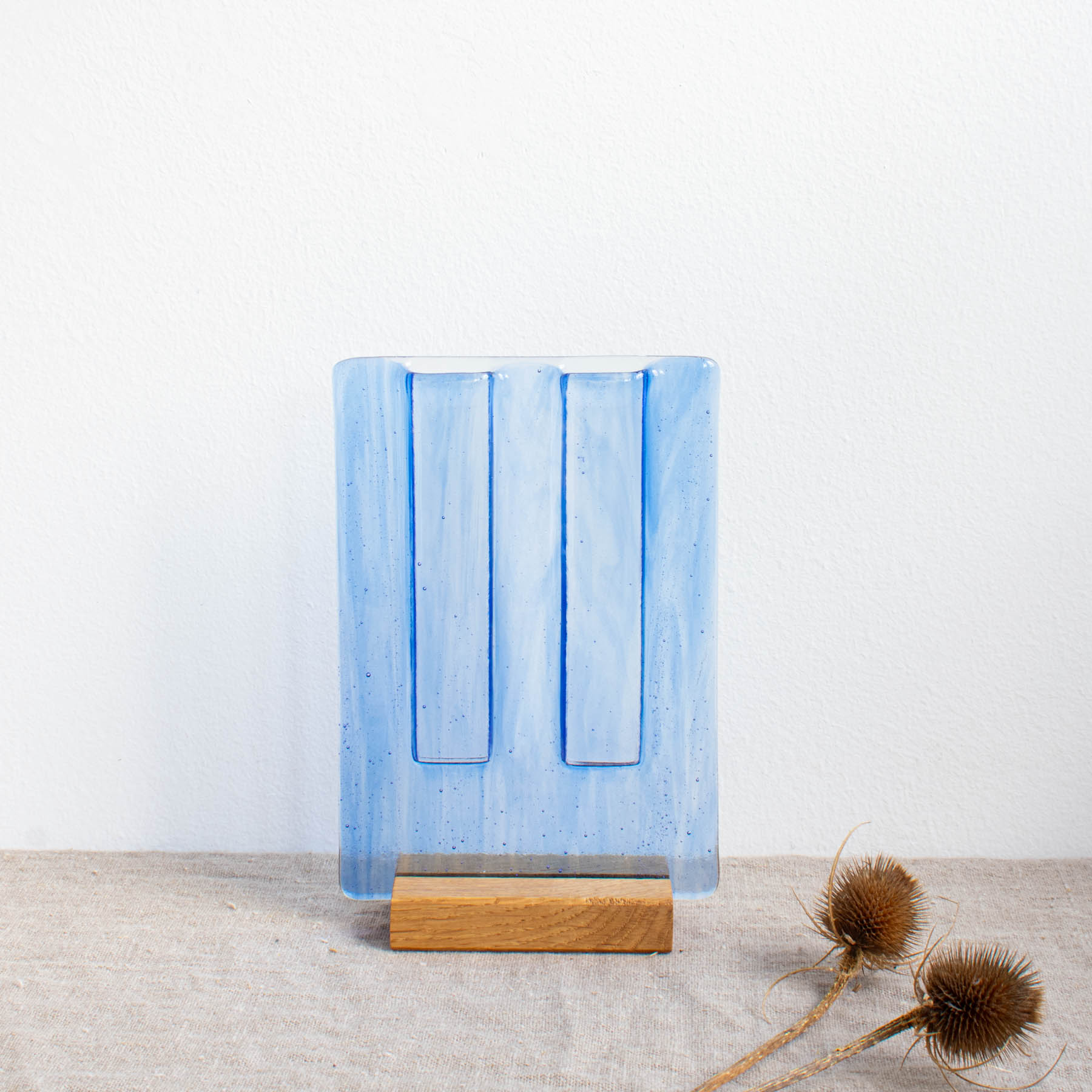 Large fused glass specimen vase. Whether plain coloured or decorated with wispy swirls, the translucent glass allows light to dance through the vase while the narrow opening lets a few stems be the focus of a display. Set in a solid oak base.