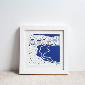 Paper cut picture featuring two rows of colourful sailing boats inspired by Cornish regattas, in a white wood frame with soft white mount.