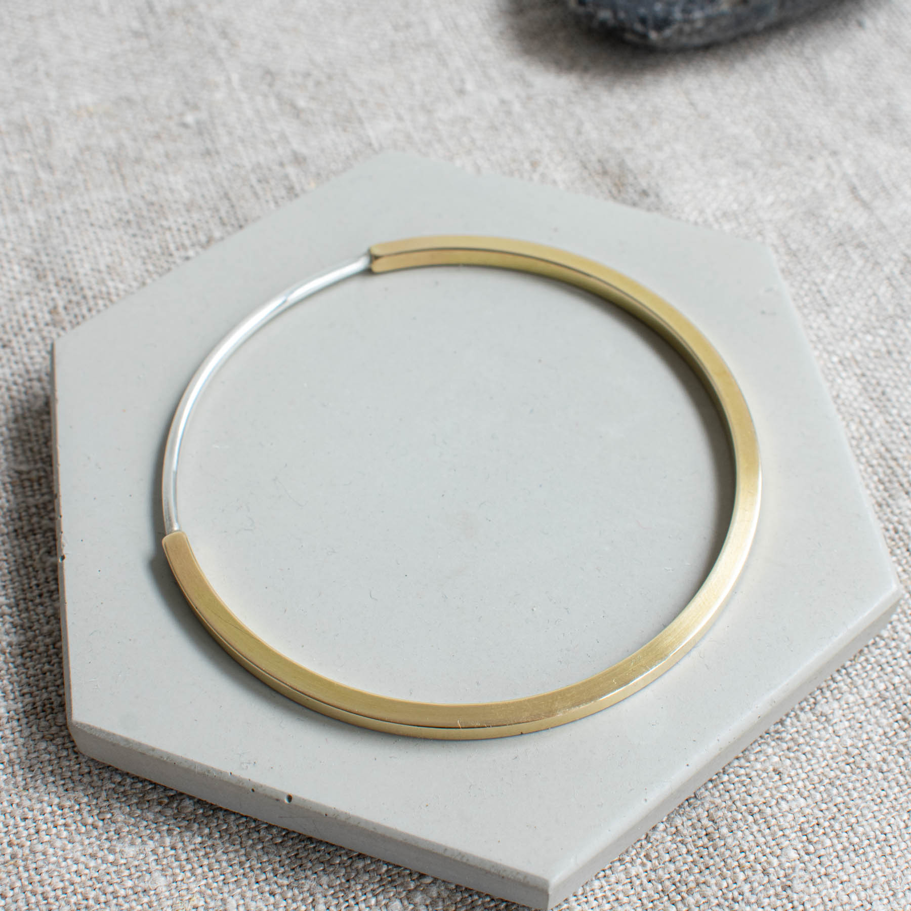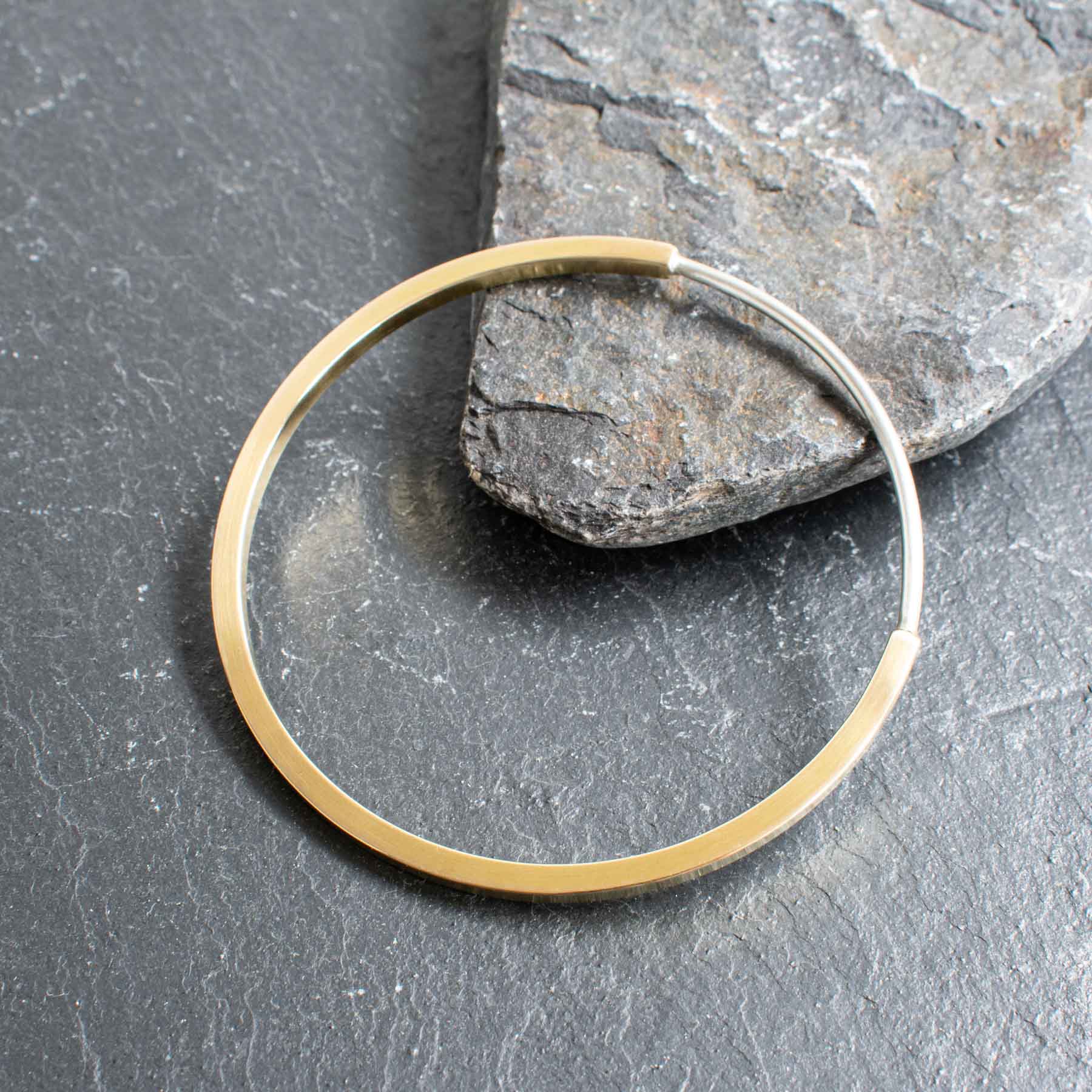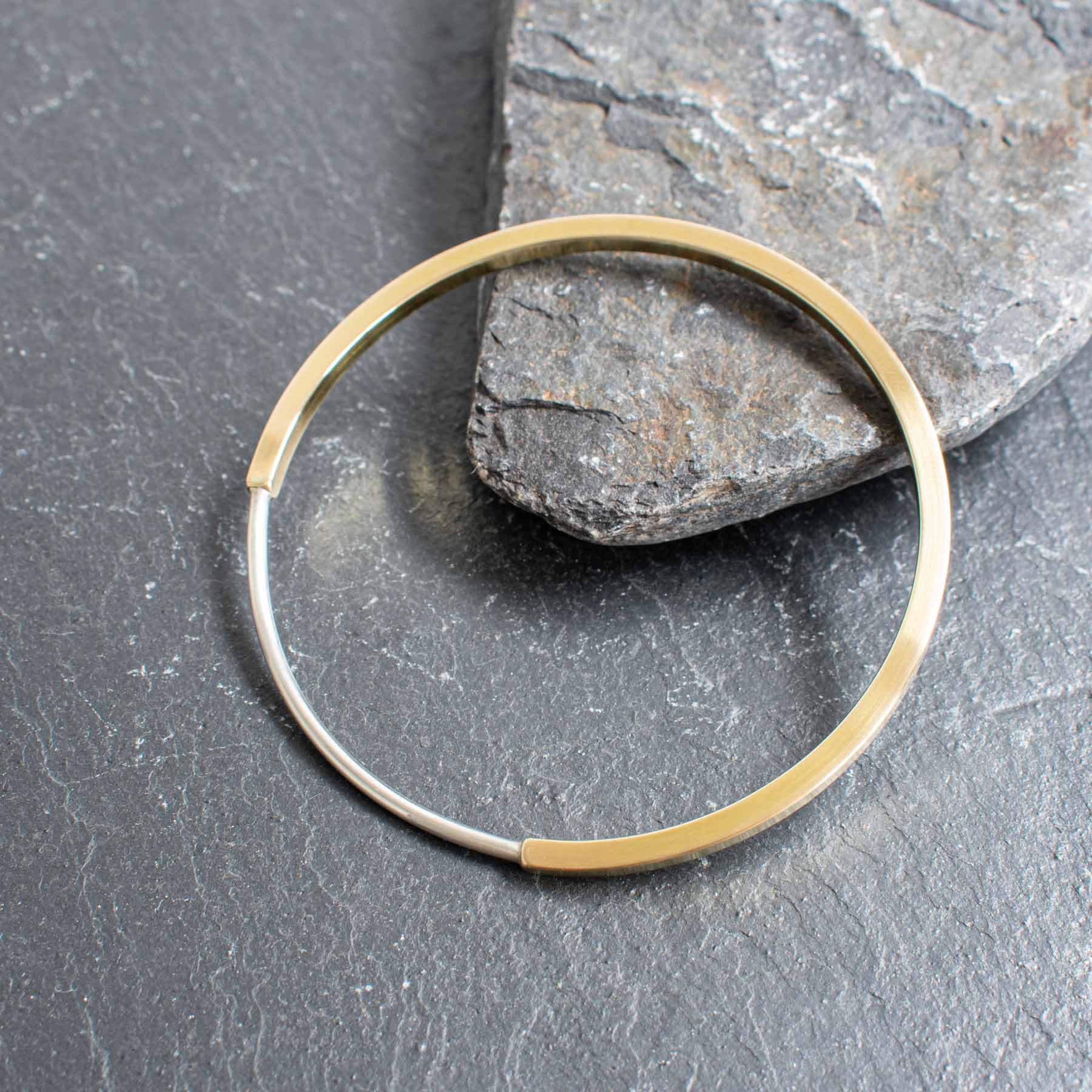 Handcrafted bangle with three quarters square brass and one quarter sterling silver wire.