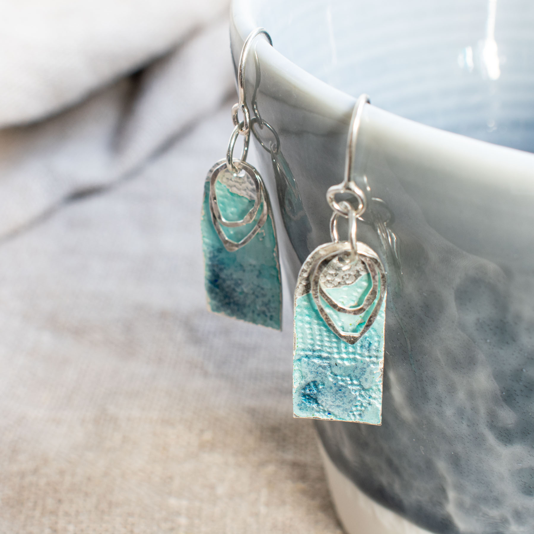 Handmade drop earrings made from textured sterling silver sheet decorated with pale blue enamel and accented with silver loops. Sterling silver earwires with silicone stoppers.