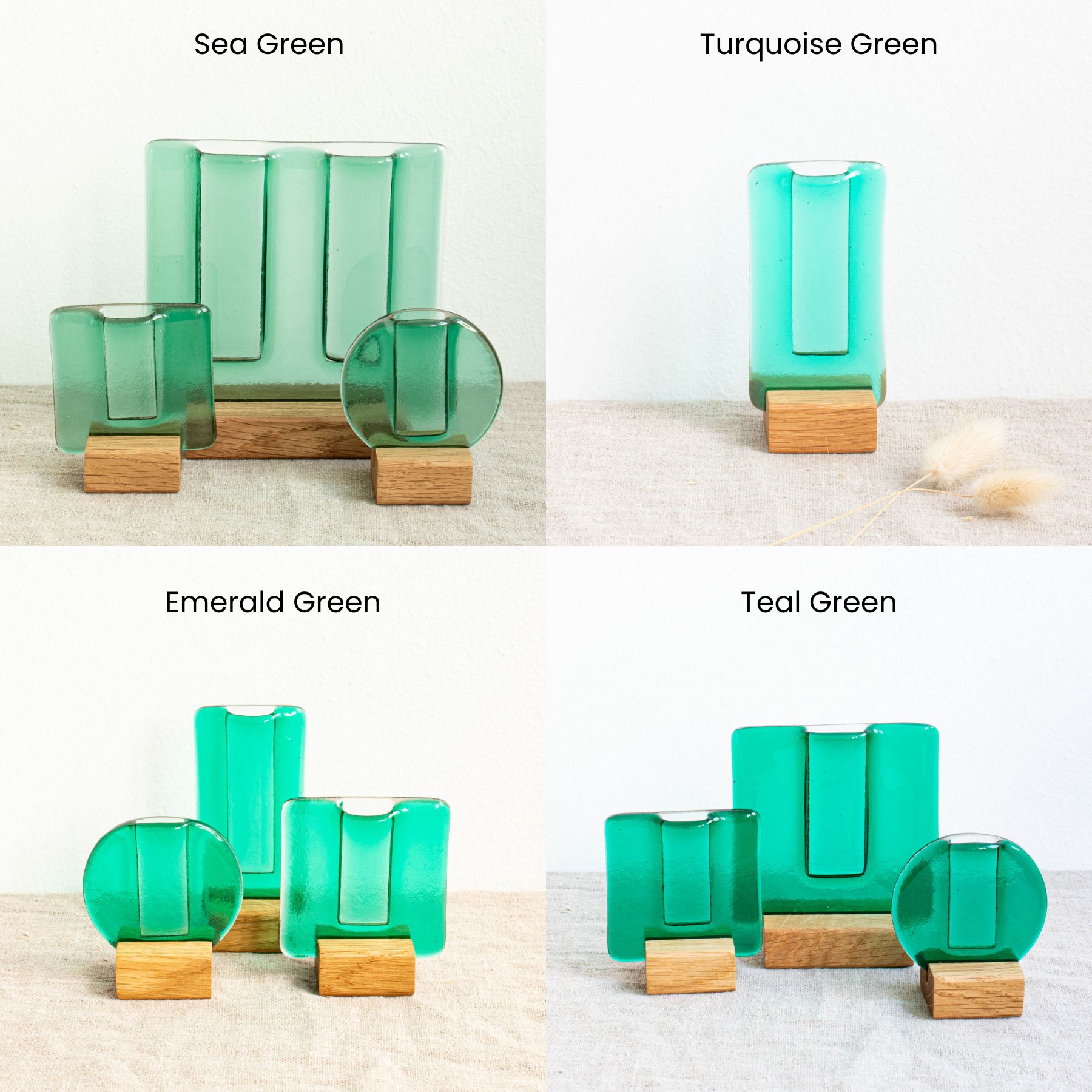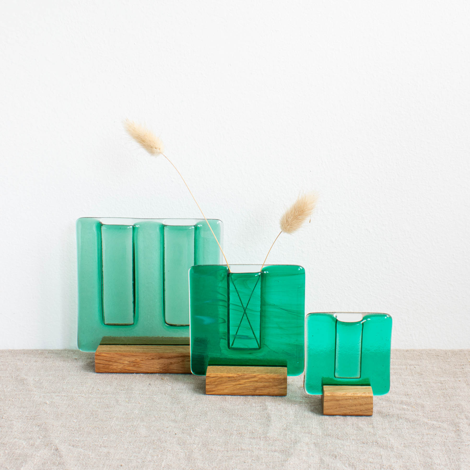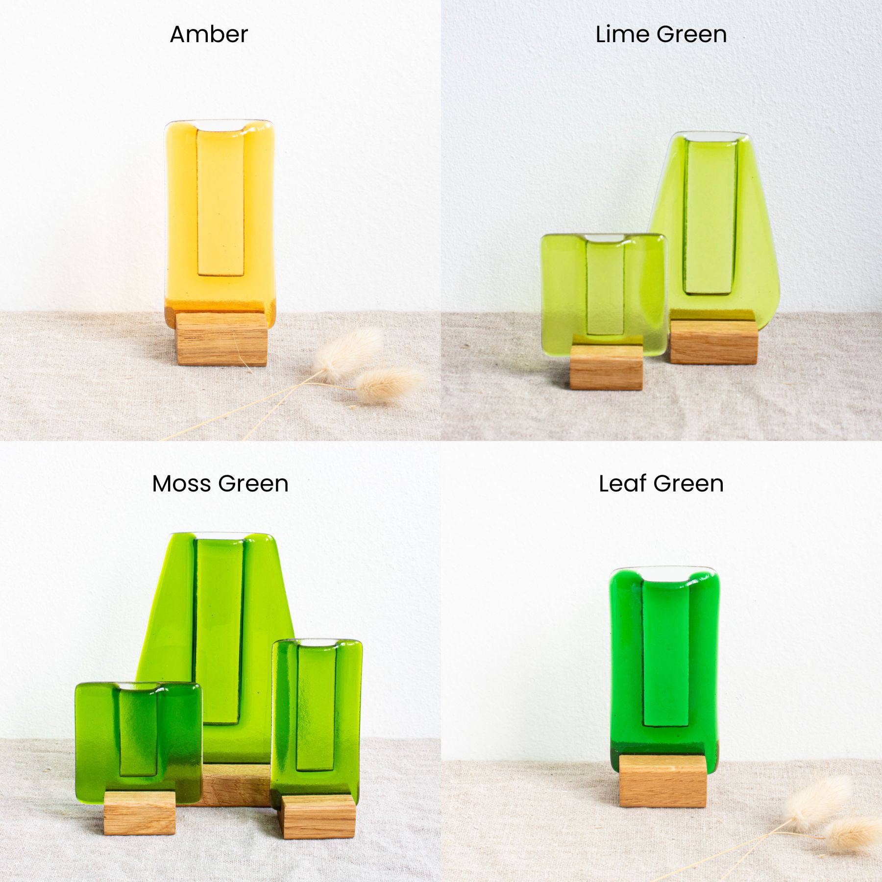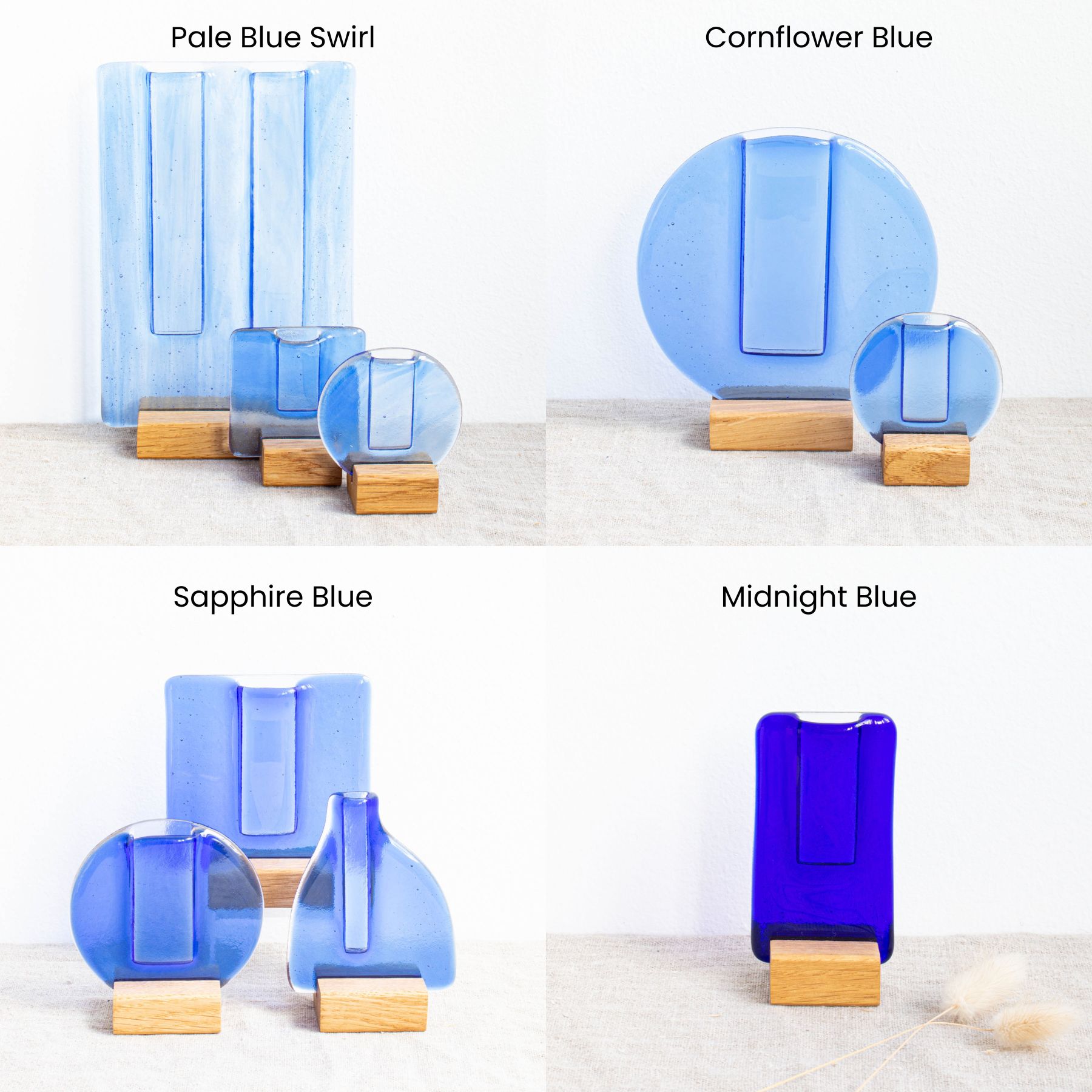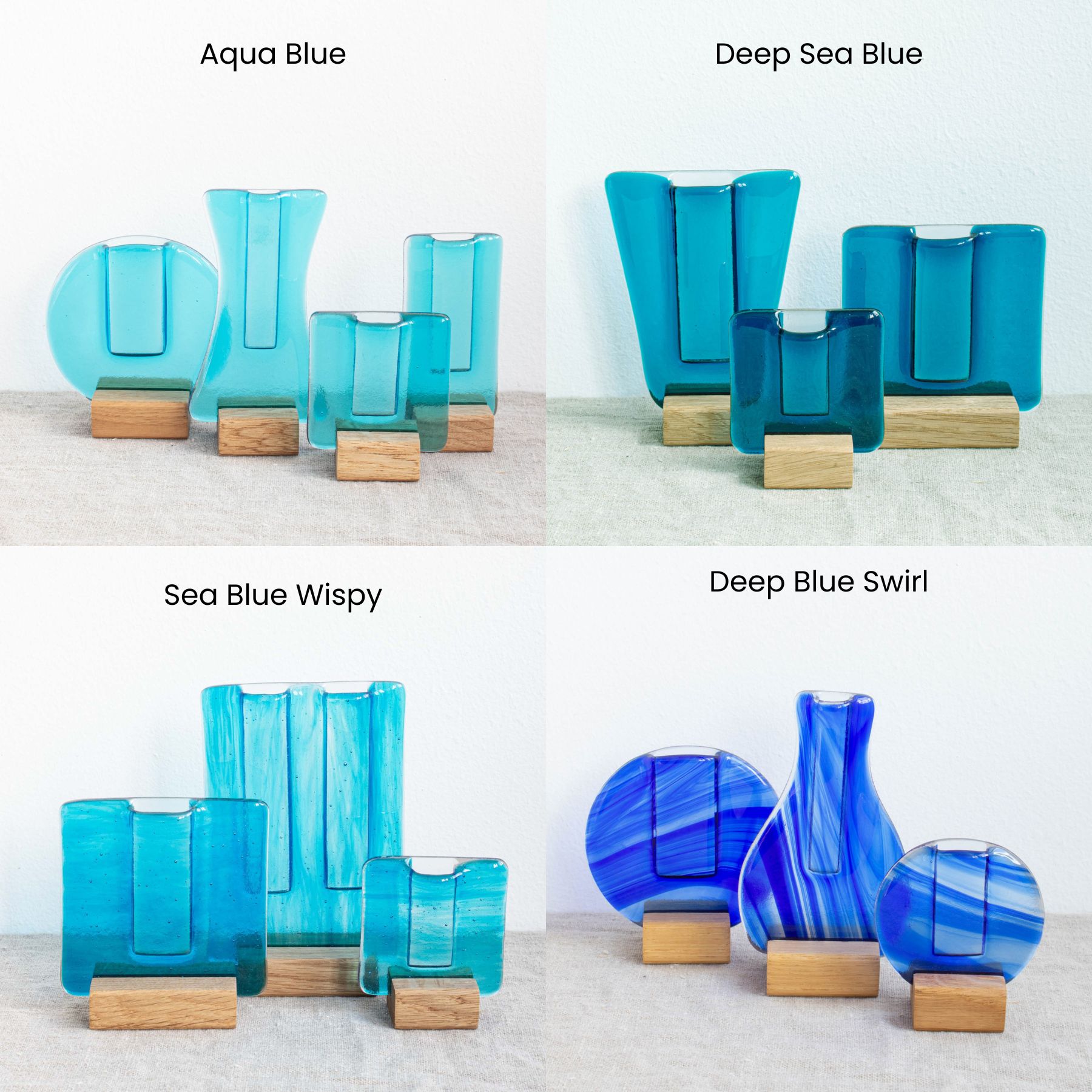 Fused glass specimen vase. Whether plain coloured or decorated with wispy swirls, the translucent glass allows light to dance through the vase while the narrow opening lets a few stems be the focus of a display. Set in a solid oak base.