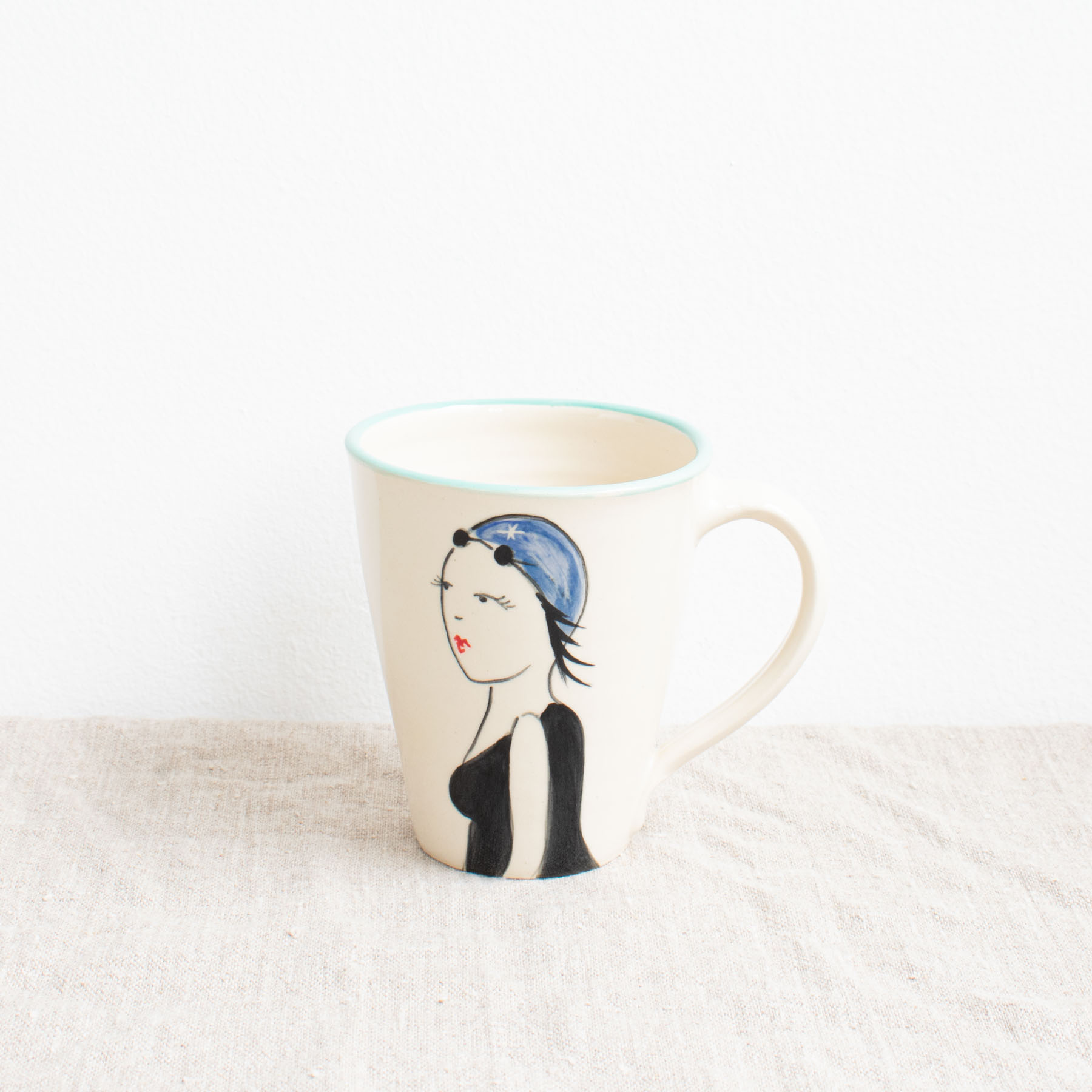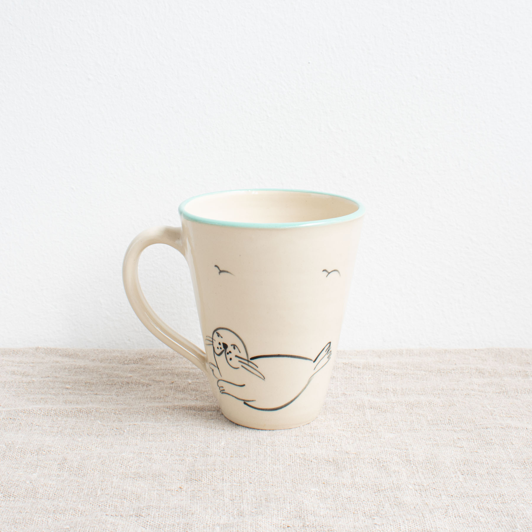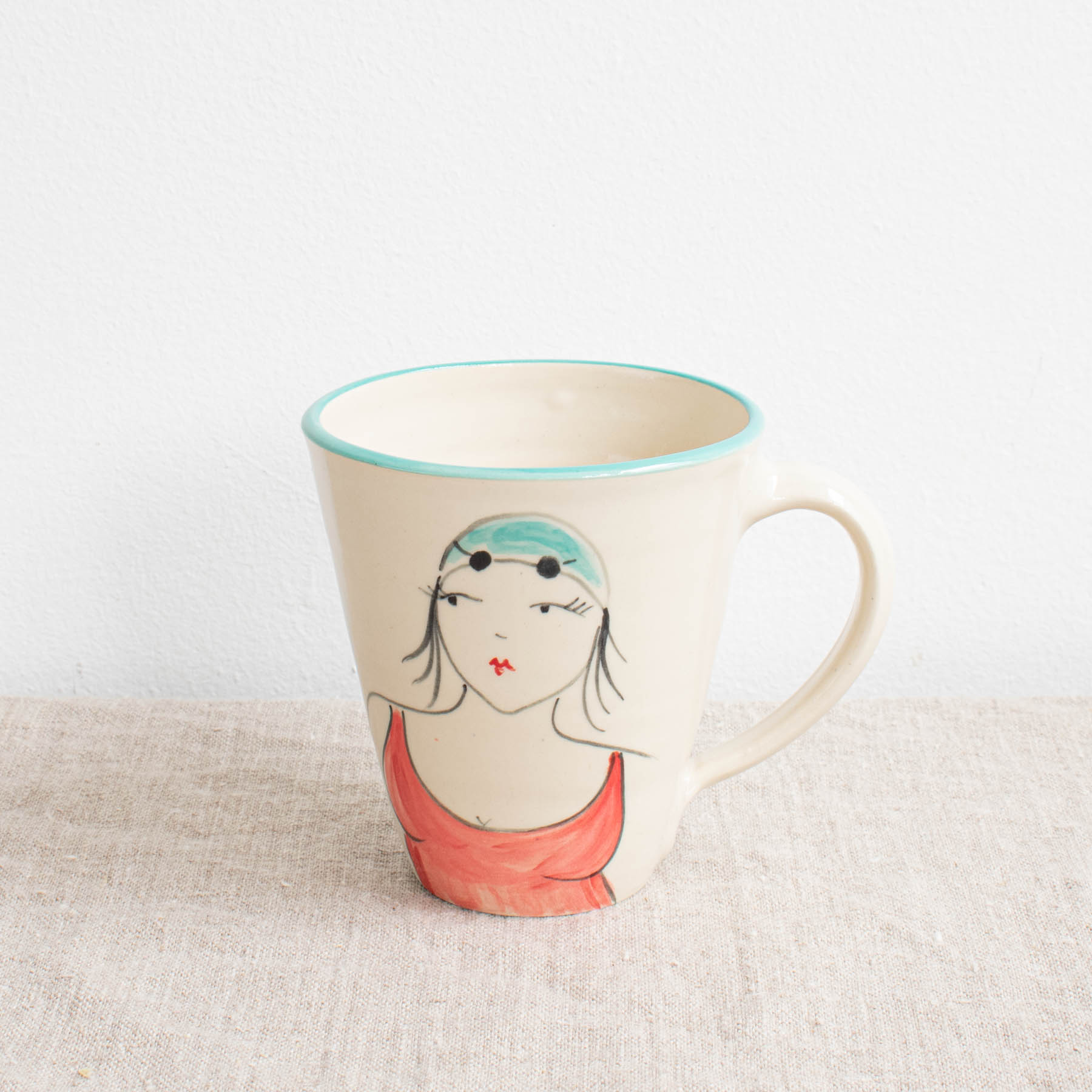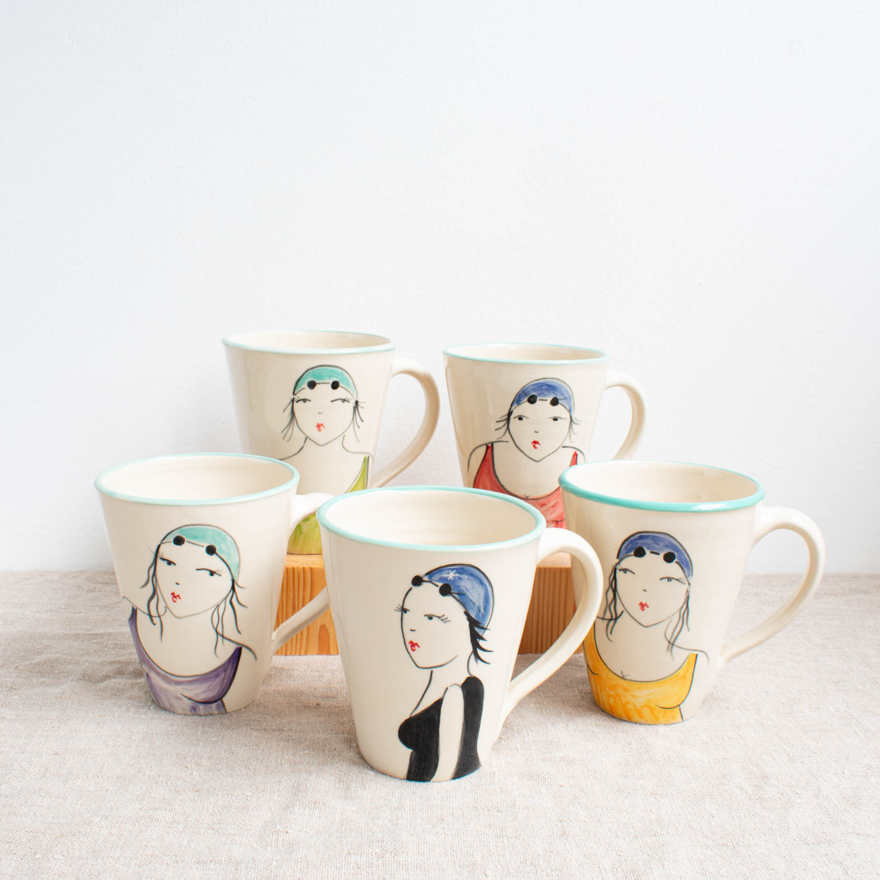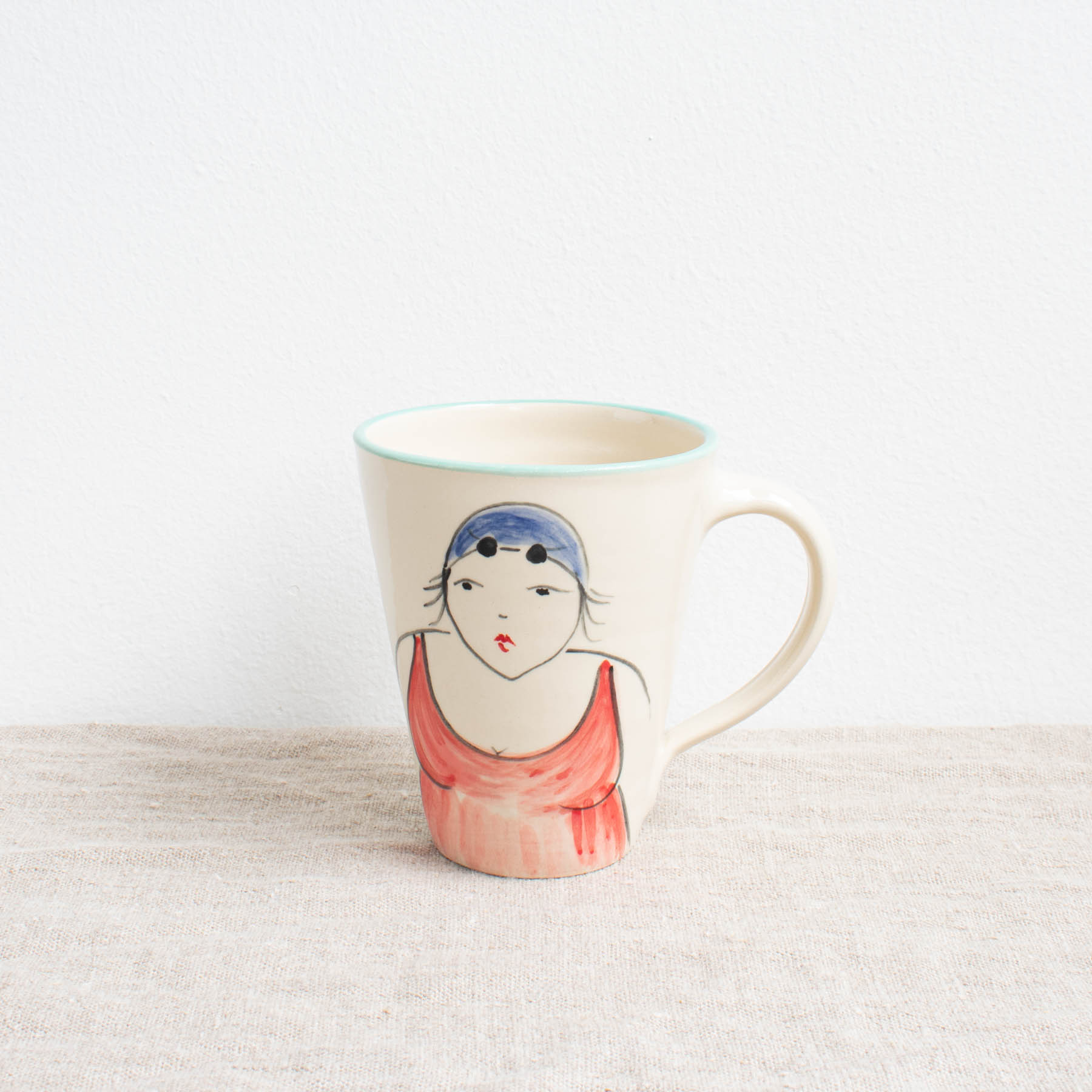 Wheel-thrown ceramic mug hand painted on the front with a vintage style illustration of lady in her swimming costume, swim cap and goggles. Individually decorated by Lucie in her Newlyn studio, the Swimmer range is inspired by characters who swim off Battery Rocks and hang out in Jubilee Pool near where she lives in Penzance. The design on the reverse of the mugs vary – waves and seagulls, seals, boat – scroll through the images to see each mug.
