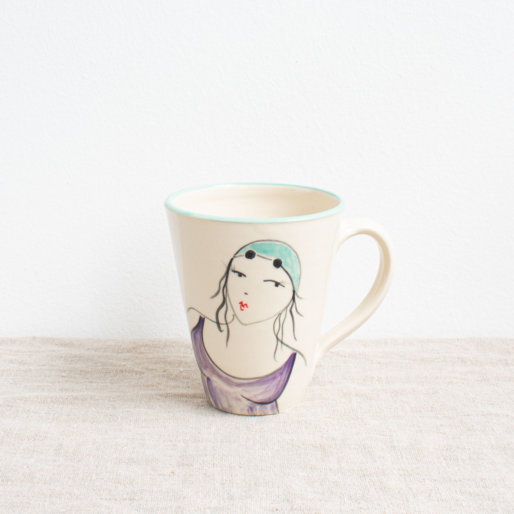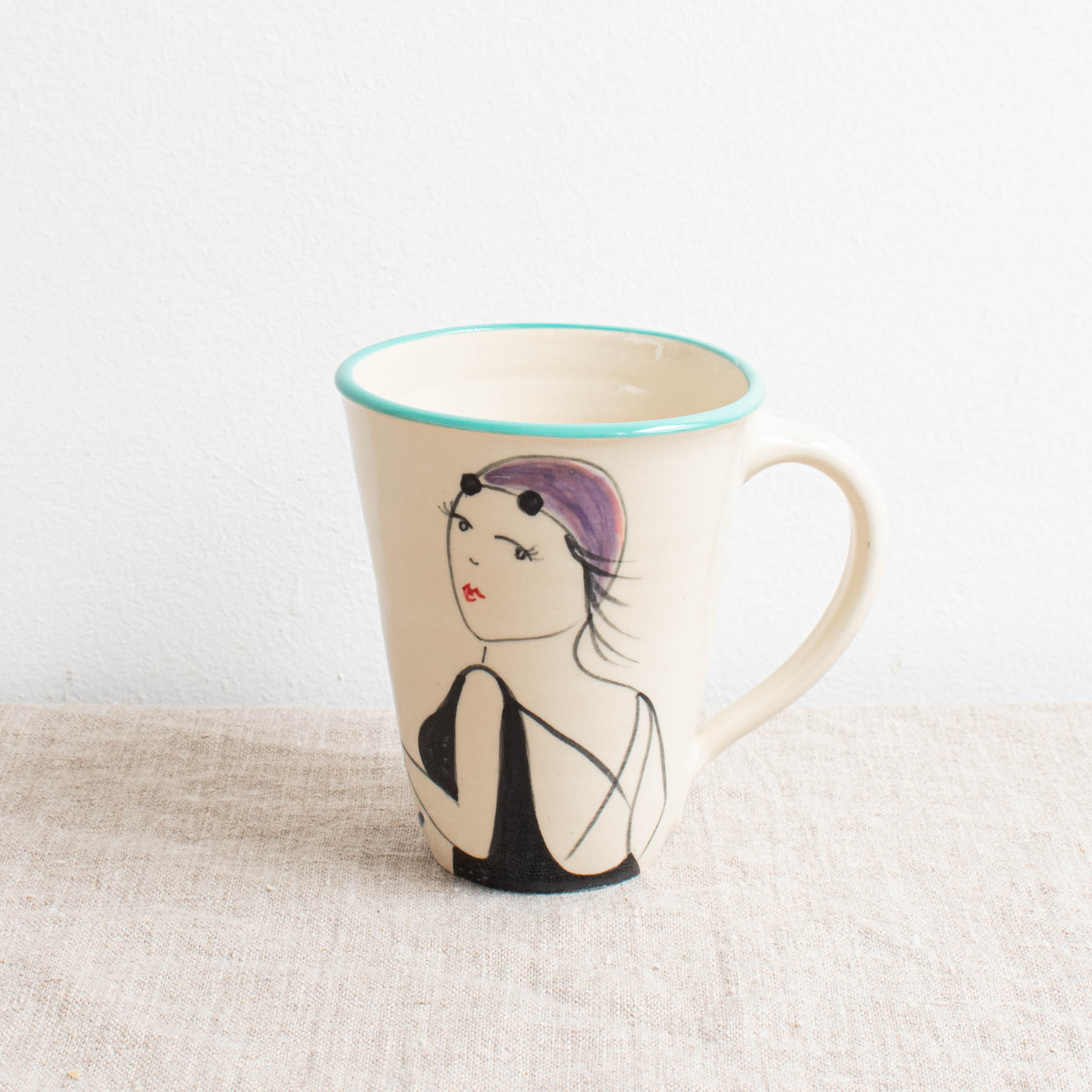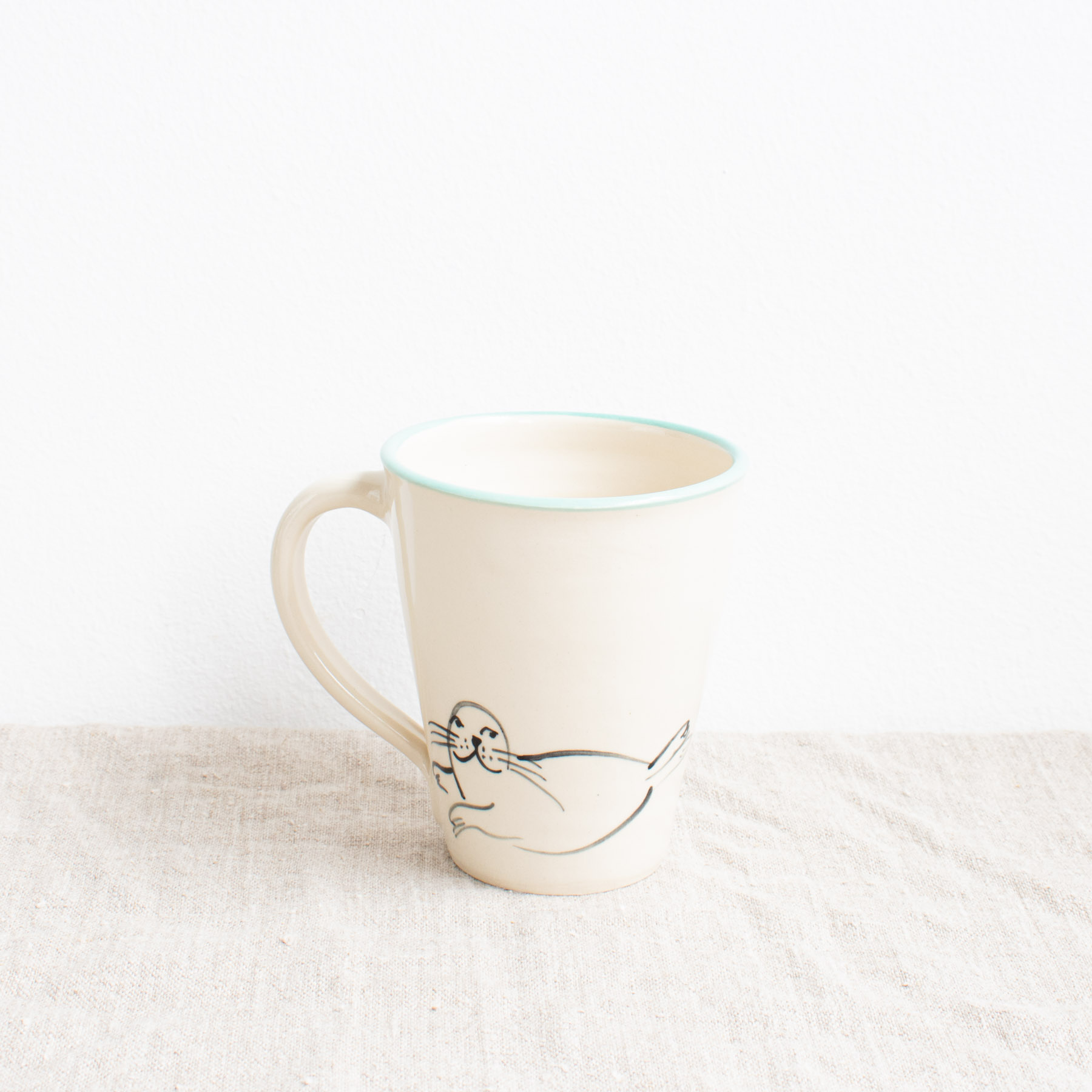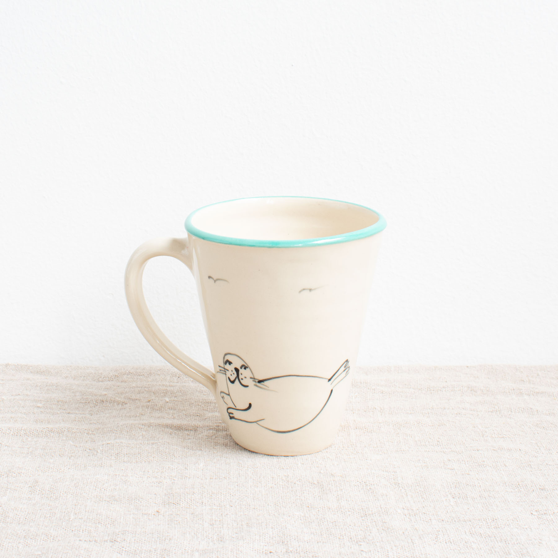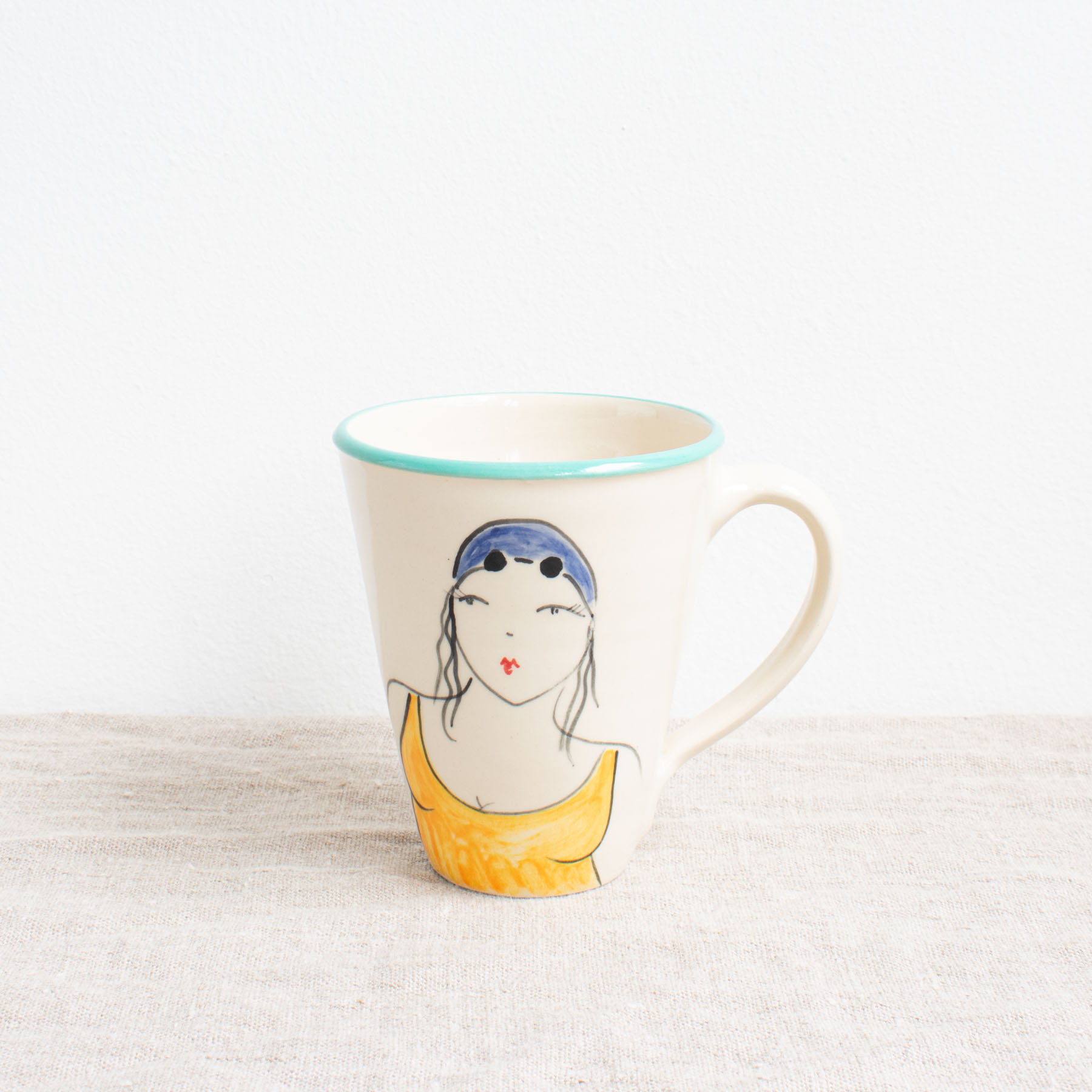 Wheel-thrown ceramic mug hand painted on the front with a vintage style illustration of lady in her swimming costume, swim cap and goggles. Individually decorated by Lucie in her Newlyn studio, the Swimmer range is inspired by characters who swim off Battery Rocks and hang out in Jubilee Pool near where she lives in Penzance. The design on the reverse of the mugs vary – waves and seagulls, seals, boat – scroll through the images to see each mug.