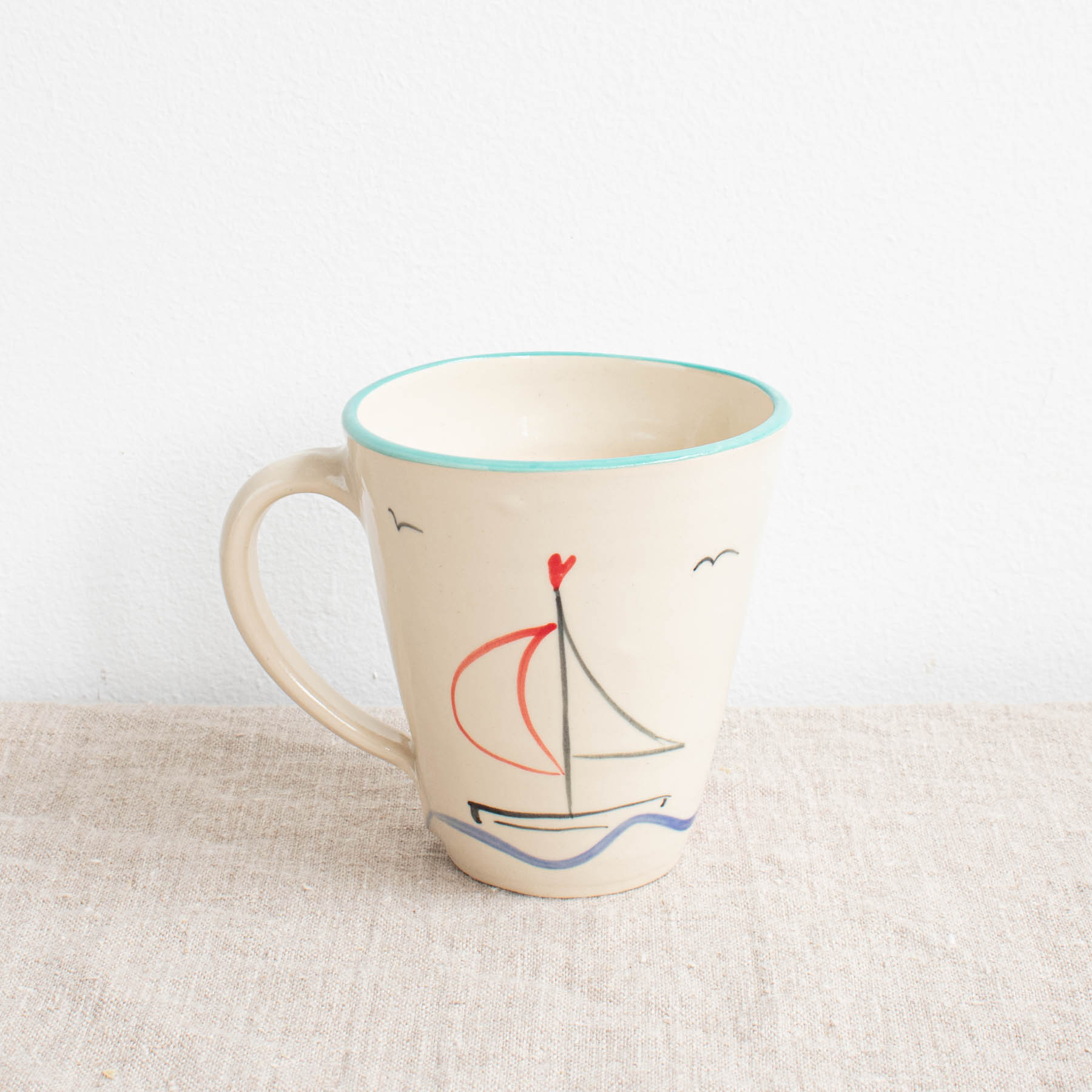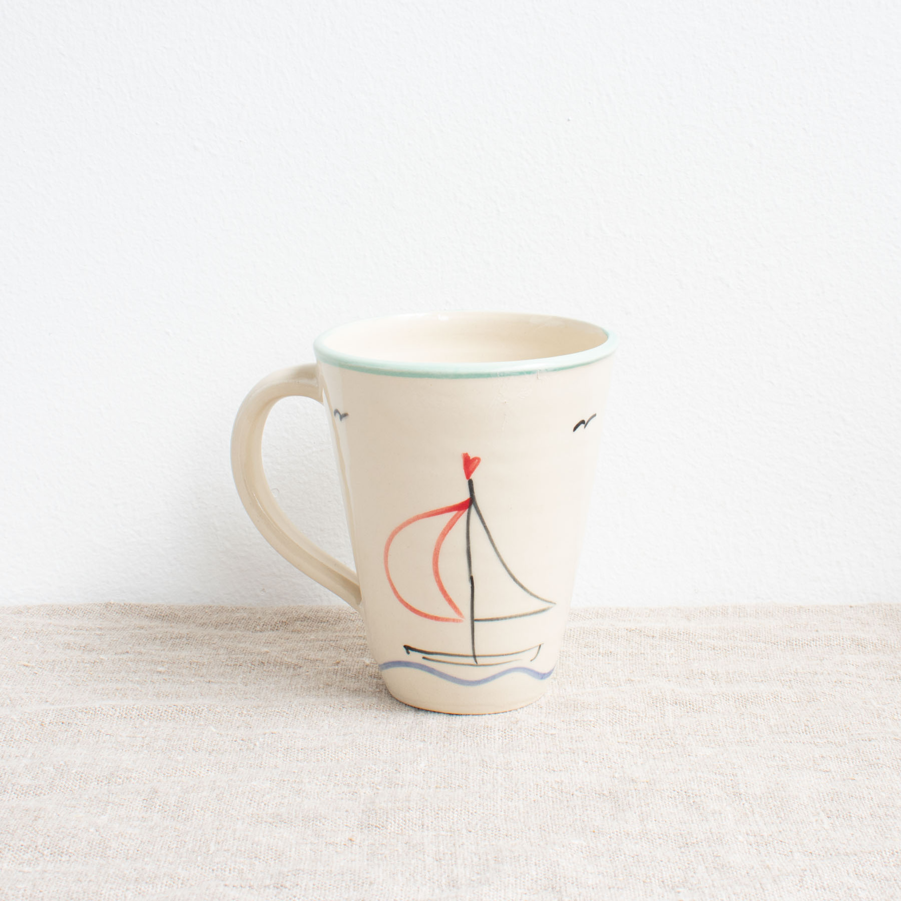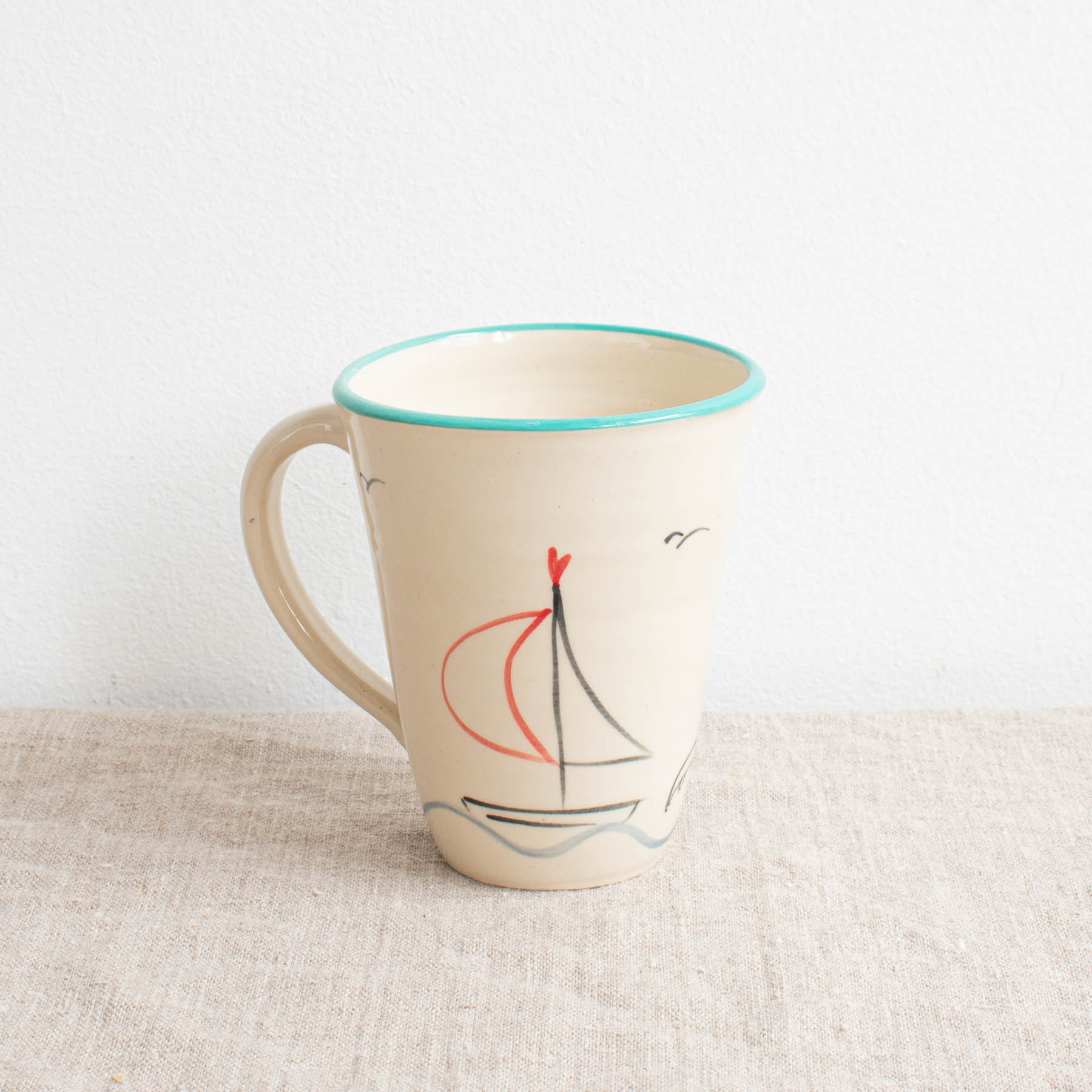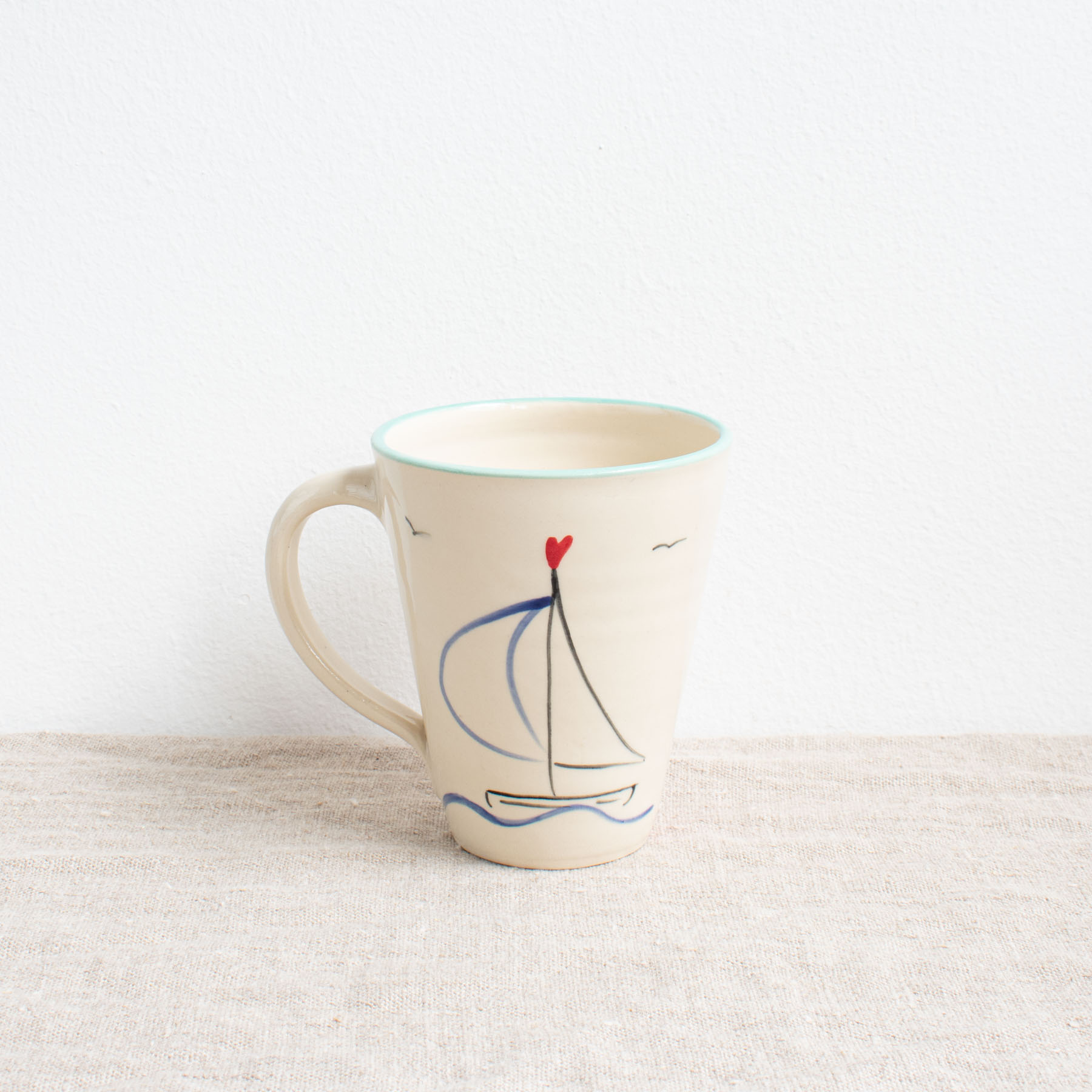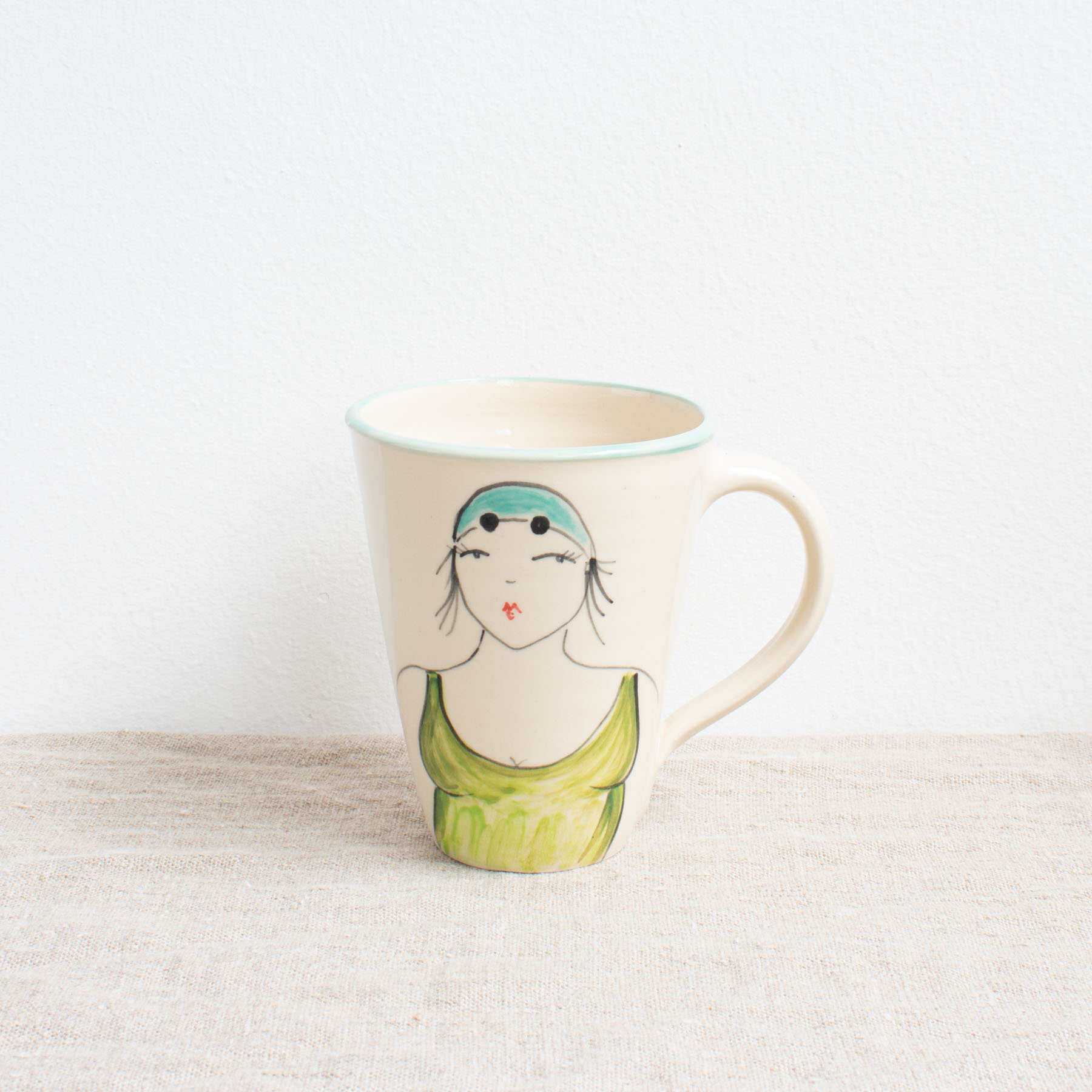 Wheel-thrown ceramic mug hand painted on the front with a vintage style illustration of lady in her swimming costume, swim cap and goggles. Individually decorated by Lucie in her Newlyn studio, the Swimmer range is inspired by characters who swim off Battery Rocks and hang out in Jubilee Pool near where she lives in Penzance. The design on the reverse of the mugs vary – waves and seagulls, seals, boat – scroll through the images to see each mug.
