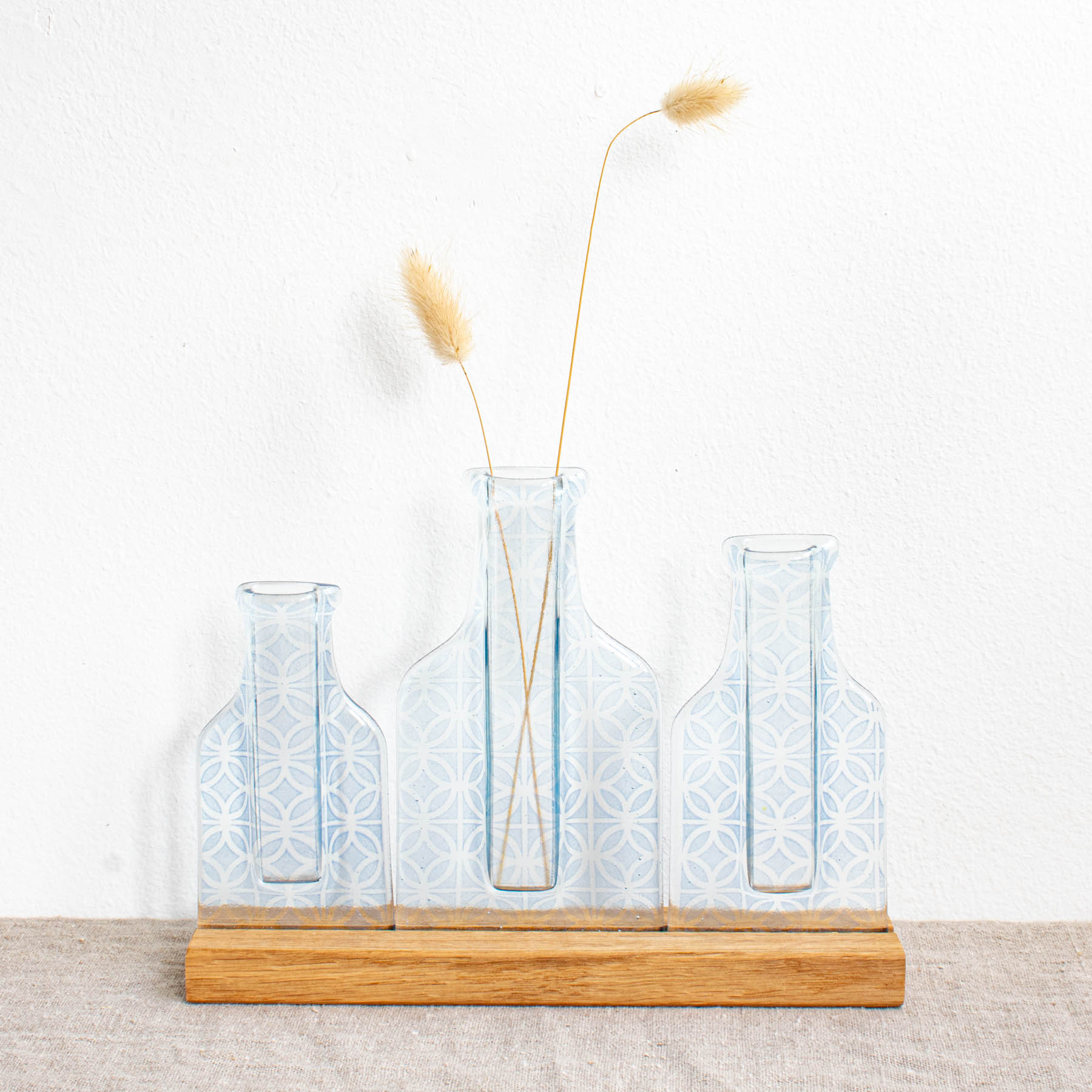 Screen printed with a blue geometric pattern using fine glass powder, the translucent glass allows light to dance through the vase while the narrow opening lets one or two stems be the focus of a display. Set in a solid oak base.