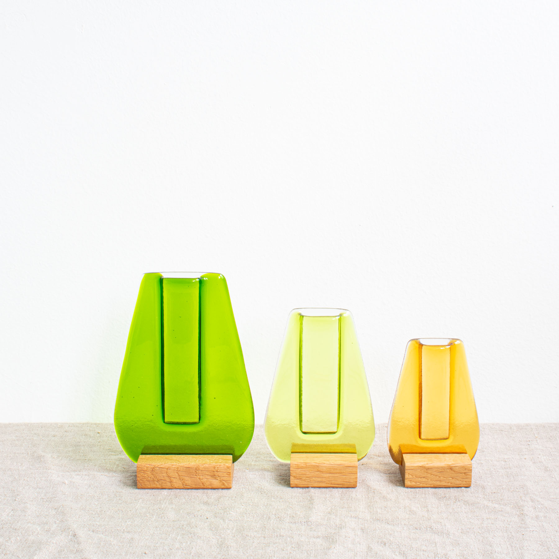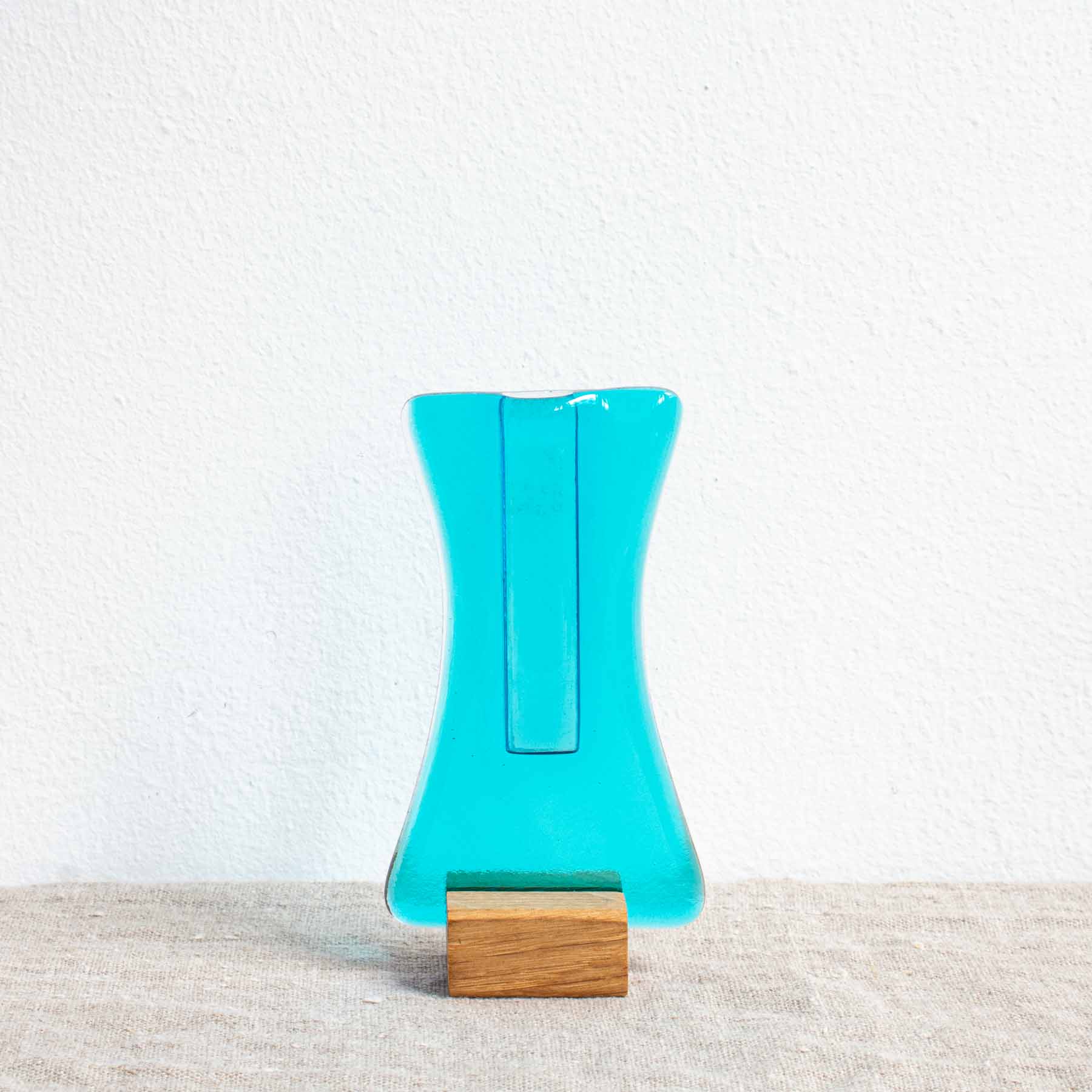 Whether plain coloured, decorated with wispy swirls, or printed with a glass powder pattern, the translucent glass allows light to dance through the vase while the narrow opening lets one or two stems be the focus of a display. Set in a solid oak base.