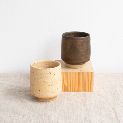 Wheel-thrown “yunomi” handmade from local St Agnes clay and finished in earthy speckled cream or dark brown with gold lustre. A yunomi is a type of handleless Japanese teacup, typically used for everyday tea drinking, often held in both hands to feel the warmth of the tea.